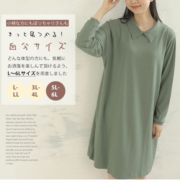 他の画像を見る オリジナル ワンピ チュニック LL 3L 4L 5L 6L 秋 秋物 秋冬 ぽっちゃり ゆったり お腹 太もも 胸周り 二の腕カバー お尻 腰周り 長袖 カットソー 春 大人カジュアル リブシリーズ ポロ襟5L 6L 長袖 チュニックワンピ | 大きいサイズの通販ならハッピーマリリン 在庫特価 定価 ¥ 2,190 のところ 価格 ¥ 1,500 税込 4.07 お気に入りに登録する