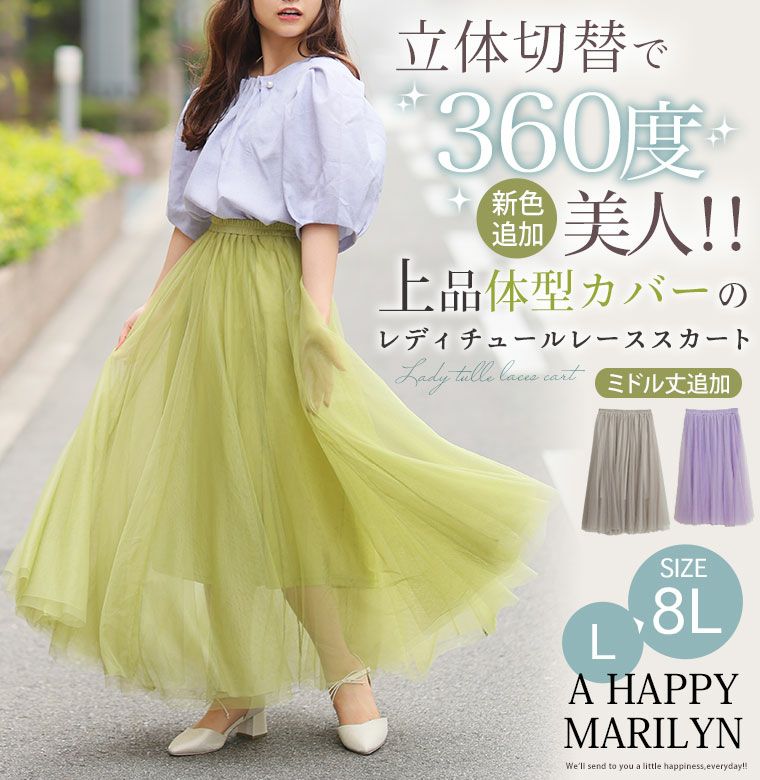 他の画像を見る オリジナル ボトムス LL 3L 4L 5L 6L 7L 8L 春 お腹 太もも お尻 腰周り 新丈追加!! 立体切替で360度美人!上品体型カバー レディ チュール レース ロングスカート | 大きいサイズの通販ならハッピーマリリン 小柄さん丈有 在庫特価 定価 ¥ 2,690 のところ 価格 ¥ 2,000 税込 4.15 お気に入りに登録する