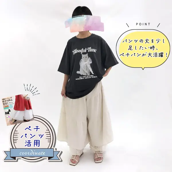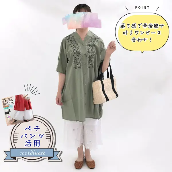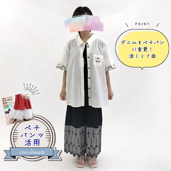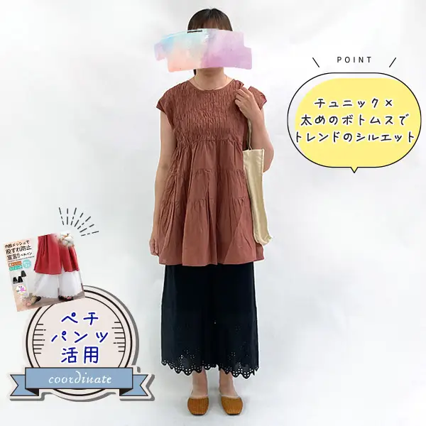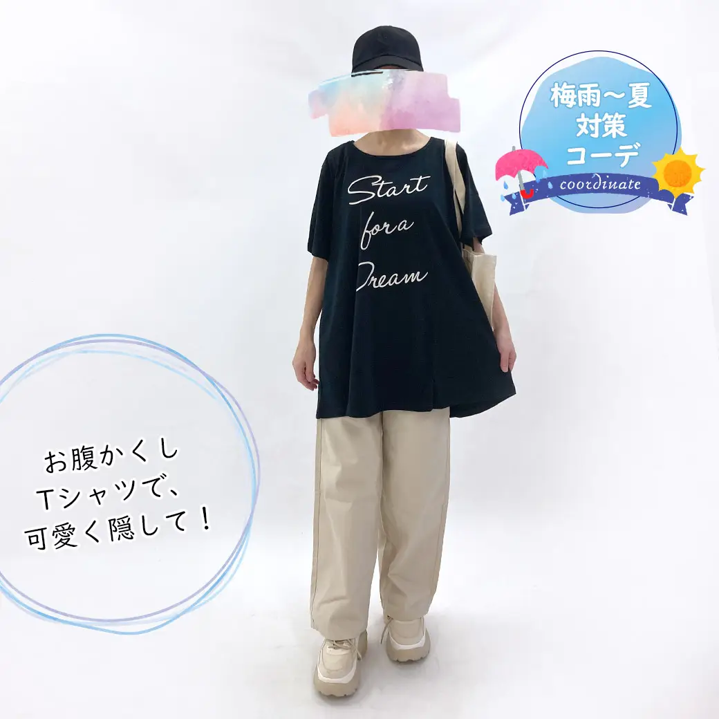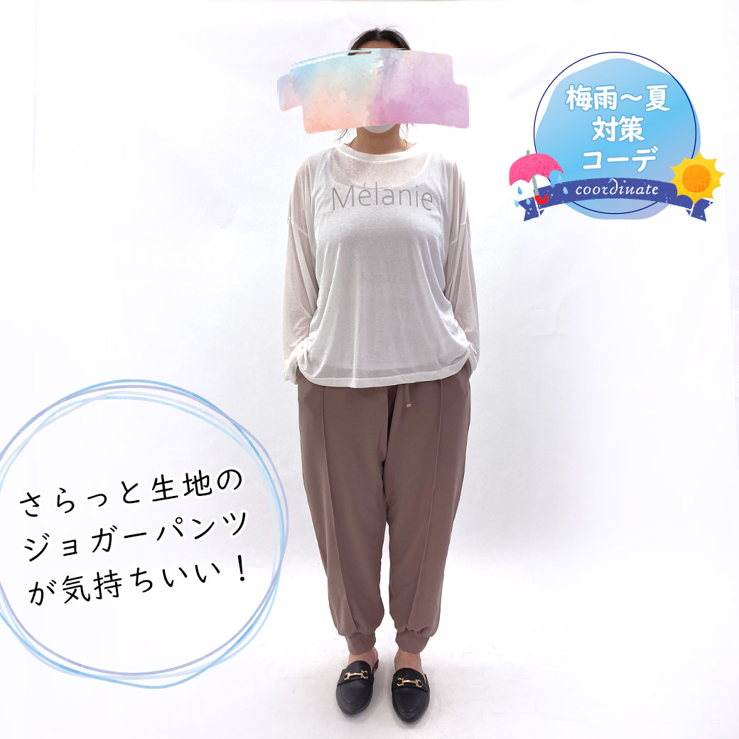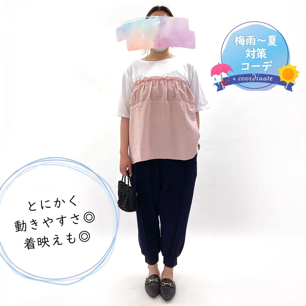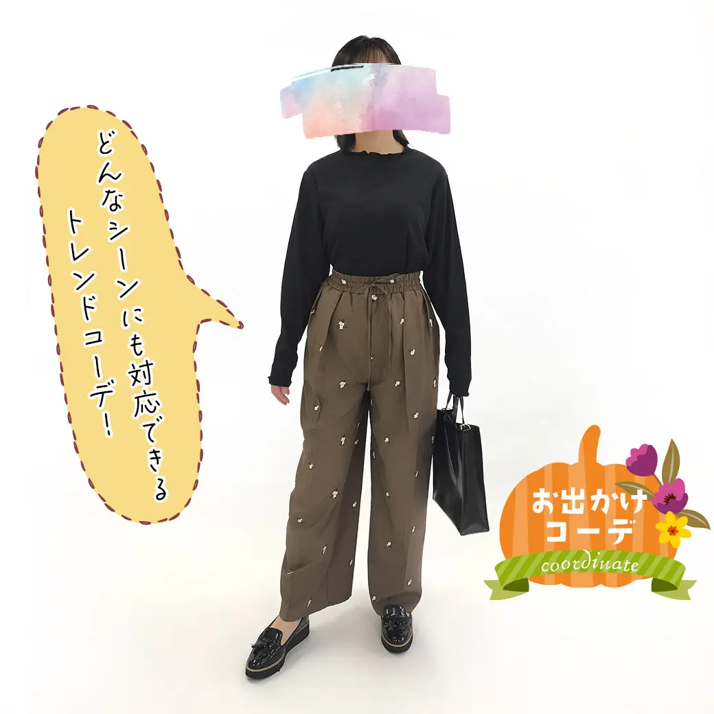 シンプルコーデながらも、花柄刺繍のパンツが、トレンド感を出してくれるコーデ。らくちんな着心地なのに、きちんと感を出してくれるから、どんなシーンのお出かけにも対応できるのがいいですね!