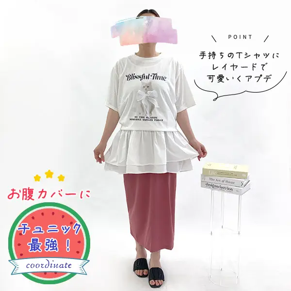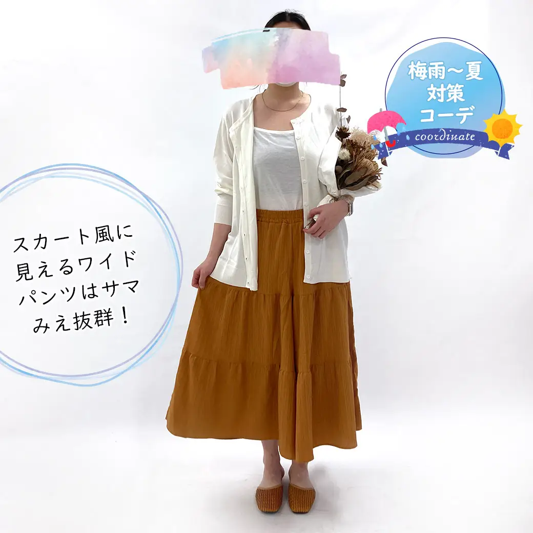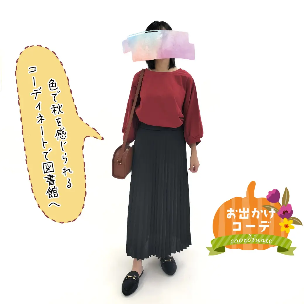 色で秋を感じられるコーディネートで図書館へ。着心地は、綿混のトップスで優しく、落ち感のあるさらっとしたスカートで、爽やかに着られます。暑さ戻りのある日にも、快適な着心地