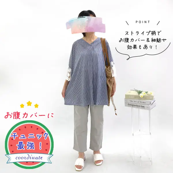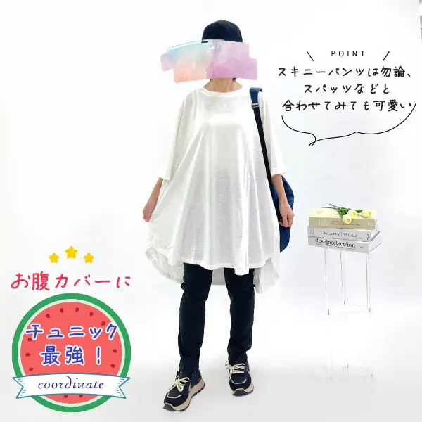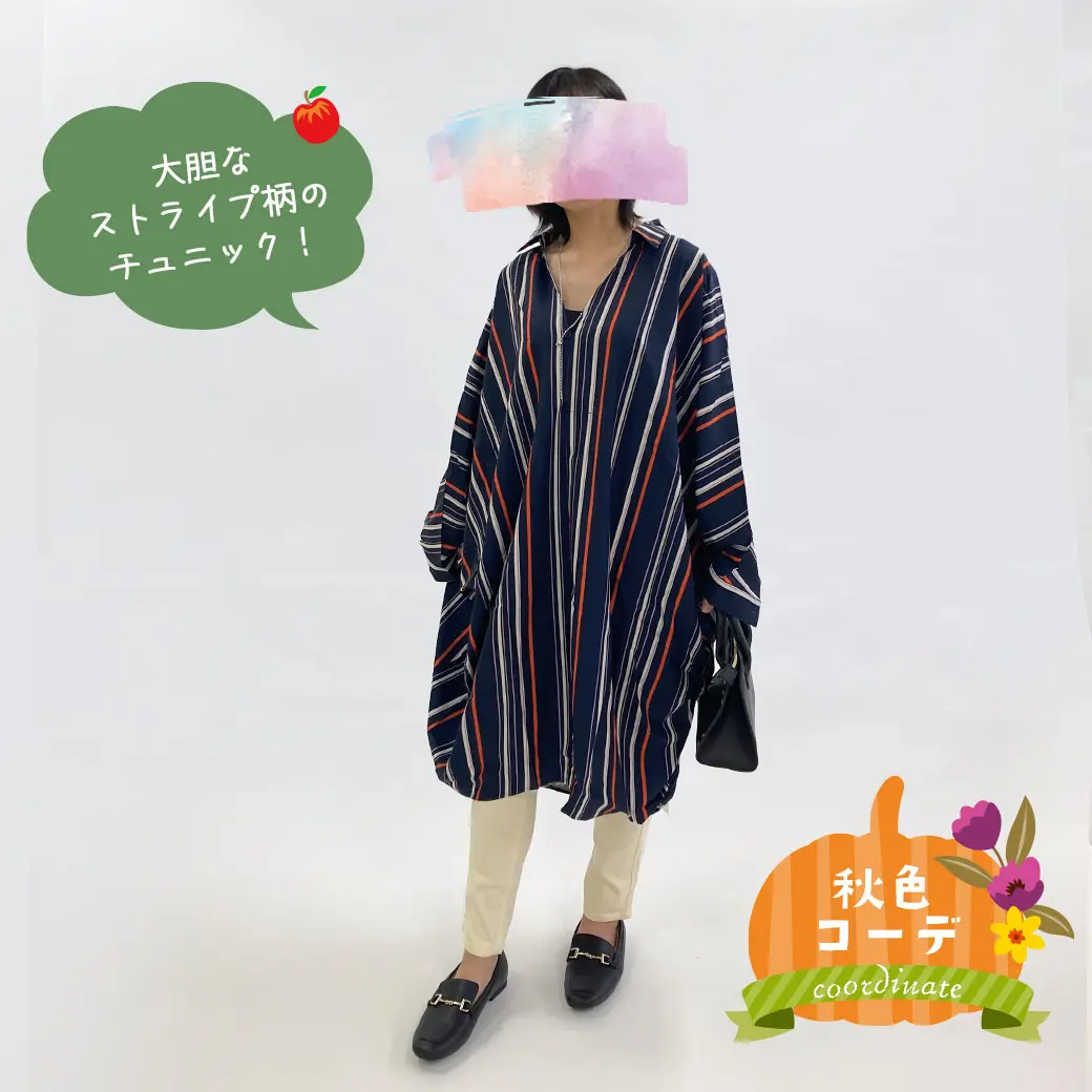大胆なストライプ柄のチュニックと定番のスキニーパンツを合わせてアイラインシルエットを作って着痩せ効果抜群のコーディネート◎ストライプに入っているオレンジ色がアクセントになって可愛い♪