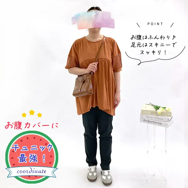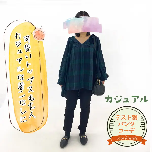 スキニーのパンツは、ストレッチが入っていてとっても動きやすい!ラブリーなカタチのトップスだけど、落ち着いたチャック柄を合わせることで、大人カジュアルな着こなしになりますね!
