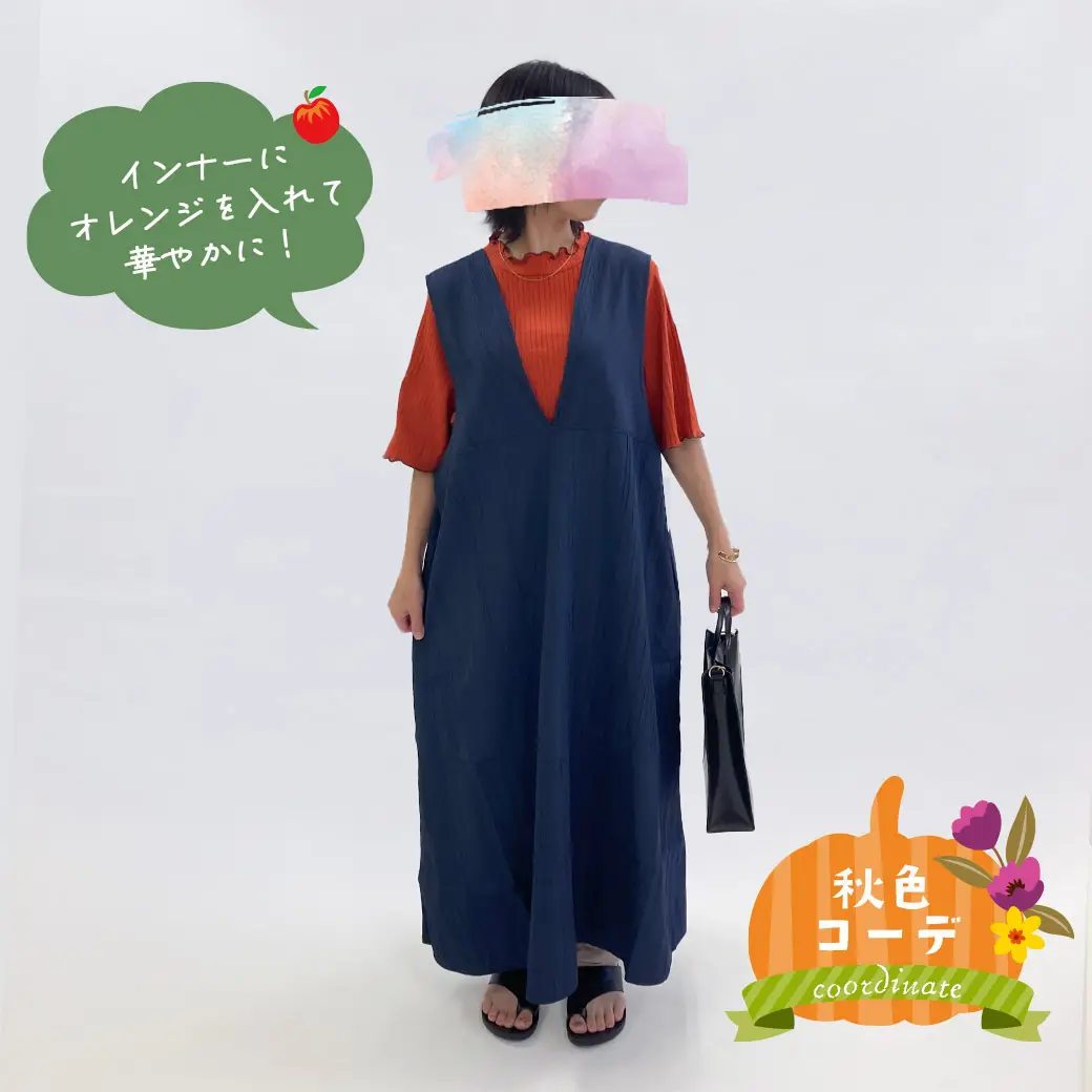 9月もまだまだ暑い日があるから、さらっと着れるジャンスカが大活躍!インナーにオレンジのトップスに合わせれば、華やかさをプラスした季節の変わり目にぴったりなコーデに!