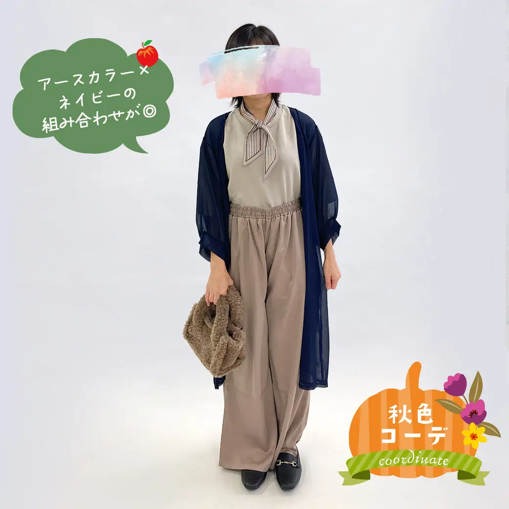 アースカラー×ネイビーの組み合わせはカジュアルすぎないお上品さもあるコーデに。夏に購入した透け感アイテムも9月はレイヤードアイテムとして着回すのがおすすめです♡