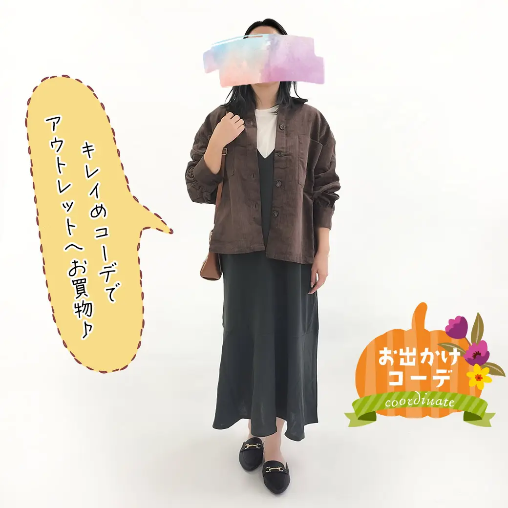 今日はアウトレットでお買い物。さっと着るだけできれいなシルエットが手に入るマーメイドジャンスカが主役のきれいめコーデ。ストレッチ素材なので動き回る日にも安心♡秋におすすめなコーデュロイのショート丈ジャケットを合わせました!