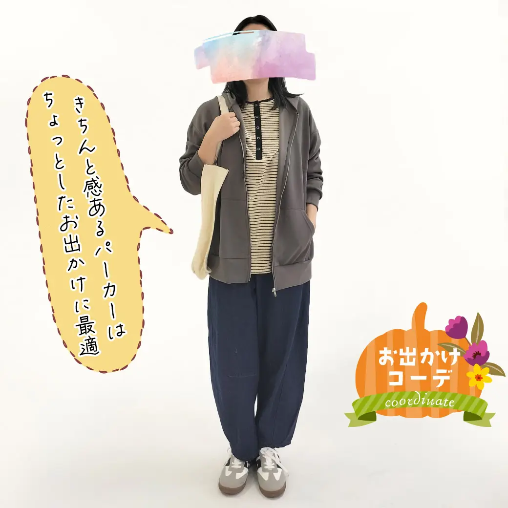 ラフだけどきちんと感の出るダンボール素材のパーカーは、ちょっとしたお出かけに最適◎ボーダーのトップスとバレルレッグデニムと合わせて大人のこなれ感漂うカジュアルコーデに。