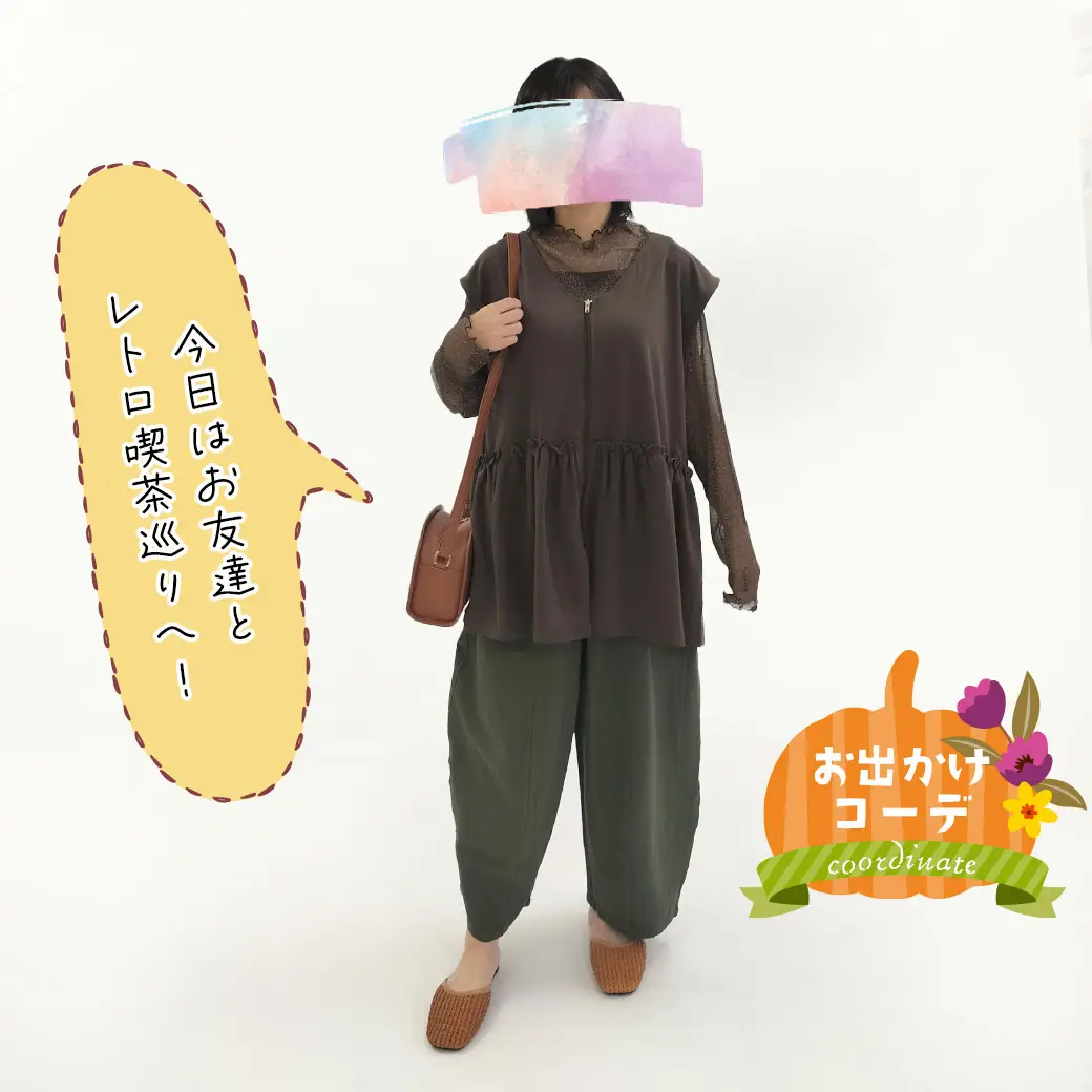 今日はお友達とレトロ喫茶巡りへ。落ち着きのある空間なので、アースカラーでまとめてみました!シアートップスとペプラムベストのレイヤードがポイントで、シンプルながらも奥行きのあるスタイルに✨ボトムスにはバレルパンツを選び程よいカジュアル感もプラスしています◎