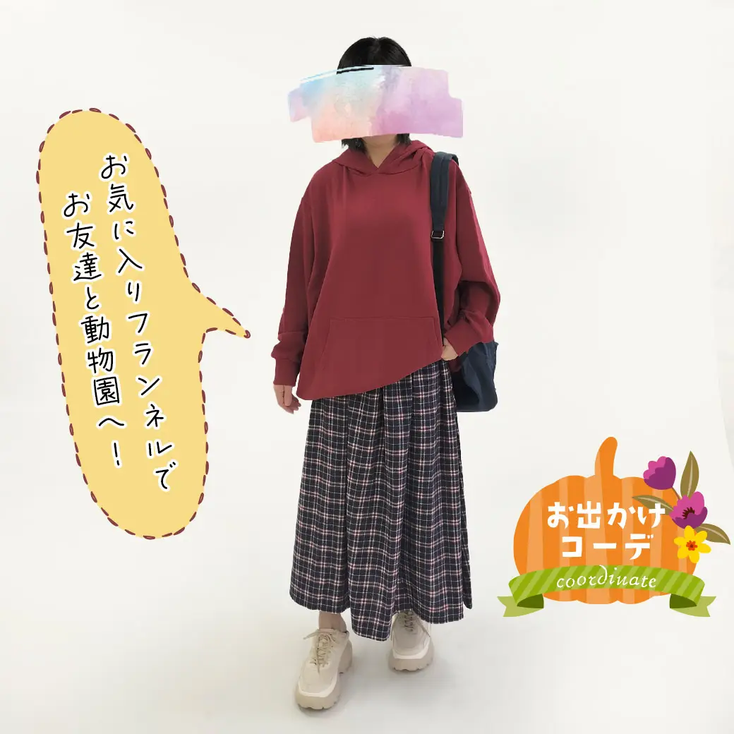 お気に入りのフランネルスカートで友だちと動物園へ!歩きやすいスニーカーとパーカーでカジュアルコーデ!