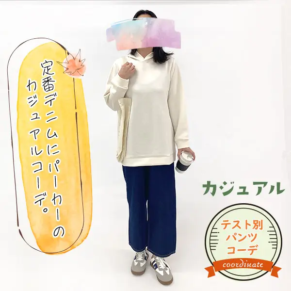 定番のデニムパンツにパーカーのカジュアルコーデ。ダンボール素材だと、表面感がお洒落で、体のラインも拾いにくいから、シンプルコーデもあか抜けた着こなしに♪