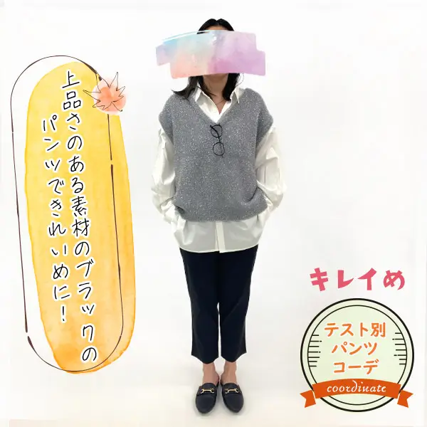 上品さのある素材のブラックのパンツは、冠婚葬祭でも普段使いでも活躍する、便利アイテム。ラメのニットベストを合わせたら、即今っぽいきれいめコーデの完成!!