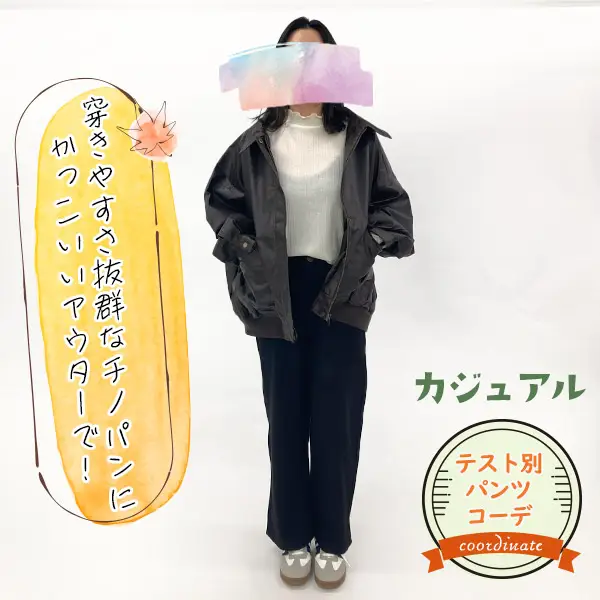 大人カジュアルスタイル。穿きやすさ抜群なチノパンツにロンTを合わせ楽々な着心地に。肌寒いのでアウターにはかっこいい感じのジャケットをプラスしました。