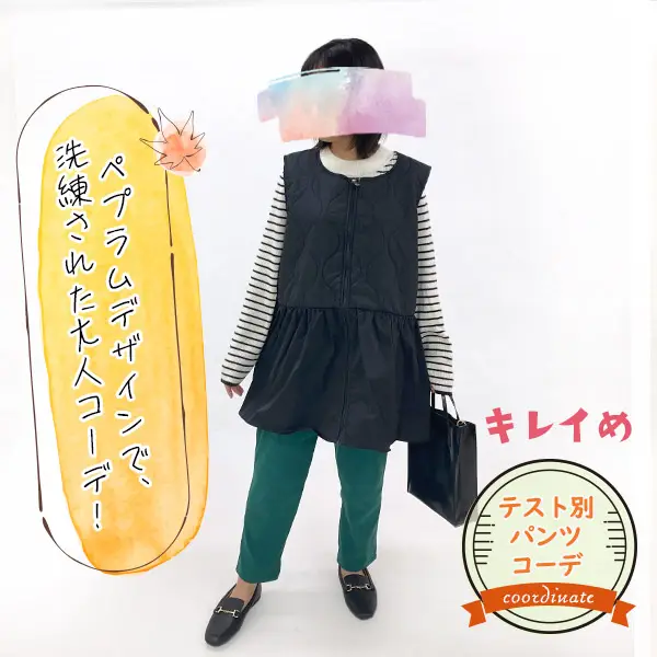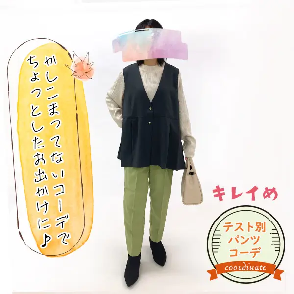 鮮やかな色のパンツに、上品なジレを合わせると、綺麗めコーデの完成。かしこまってないコーデだから、ちょっとしたお出かけに最適♪