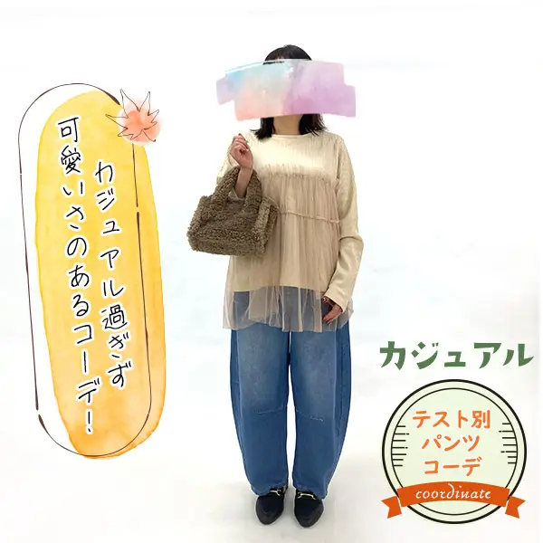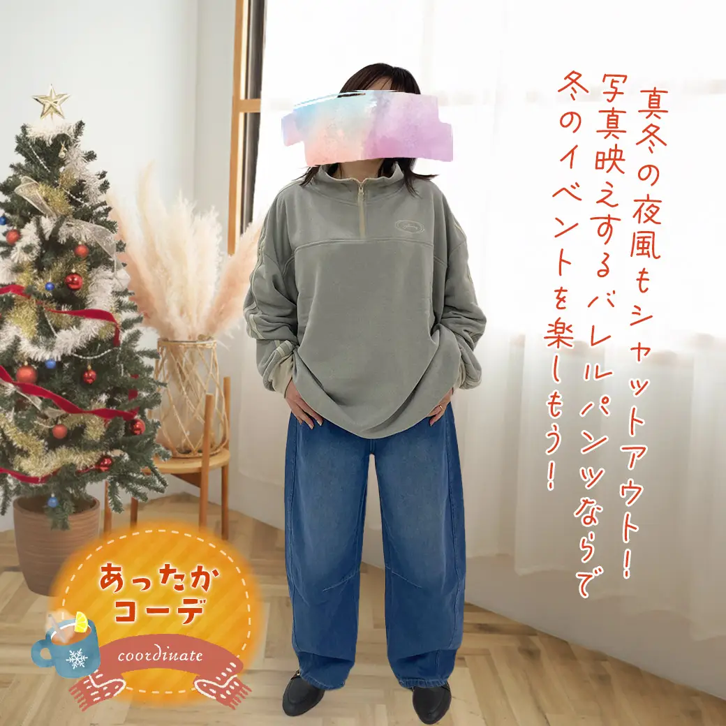 バレルで脚のラインを隠しつつトレンド感出しました。トップスには薄手のものを合わせ、アウターで体温調整。