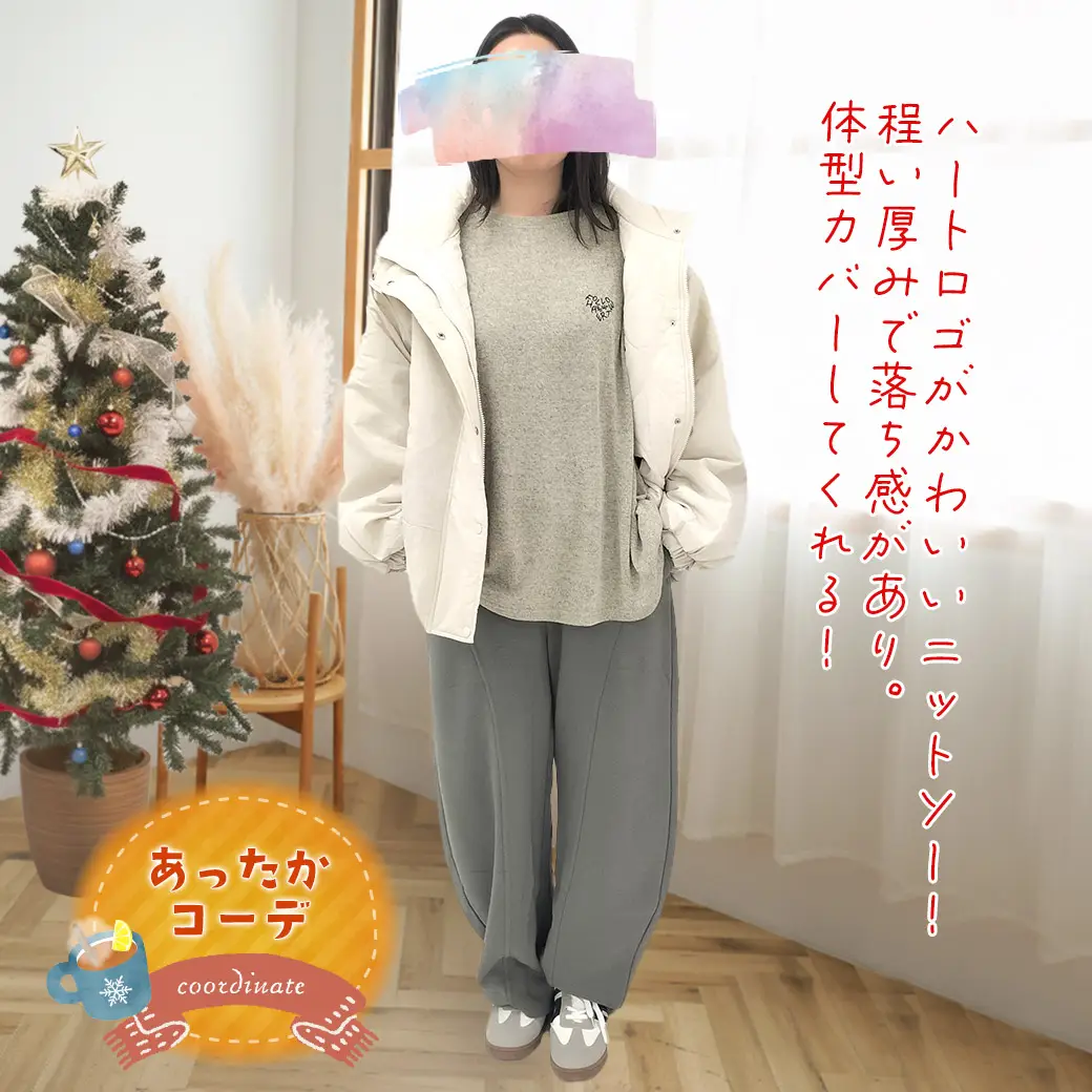 ハートロゴ刺繍がさりげなくシンプルだけどこなれ感あるTは程い厚みなので、1枚でもレイヤーでも使える万能トップス。スウェットパンツを合わせ全体的にゆったりシルエットに。外出時トップス1枚だと寒いのでふわっとボリュームのあるアウターを合わせカジュアルスタイルの完成。学校やちょっとしたお出かけに。