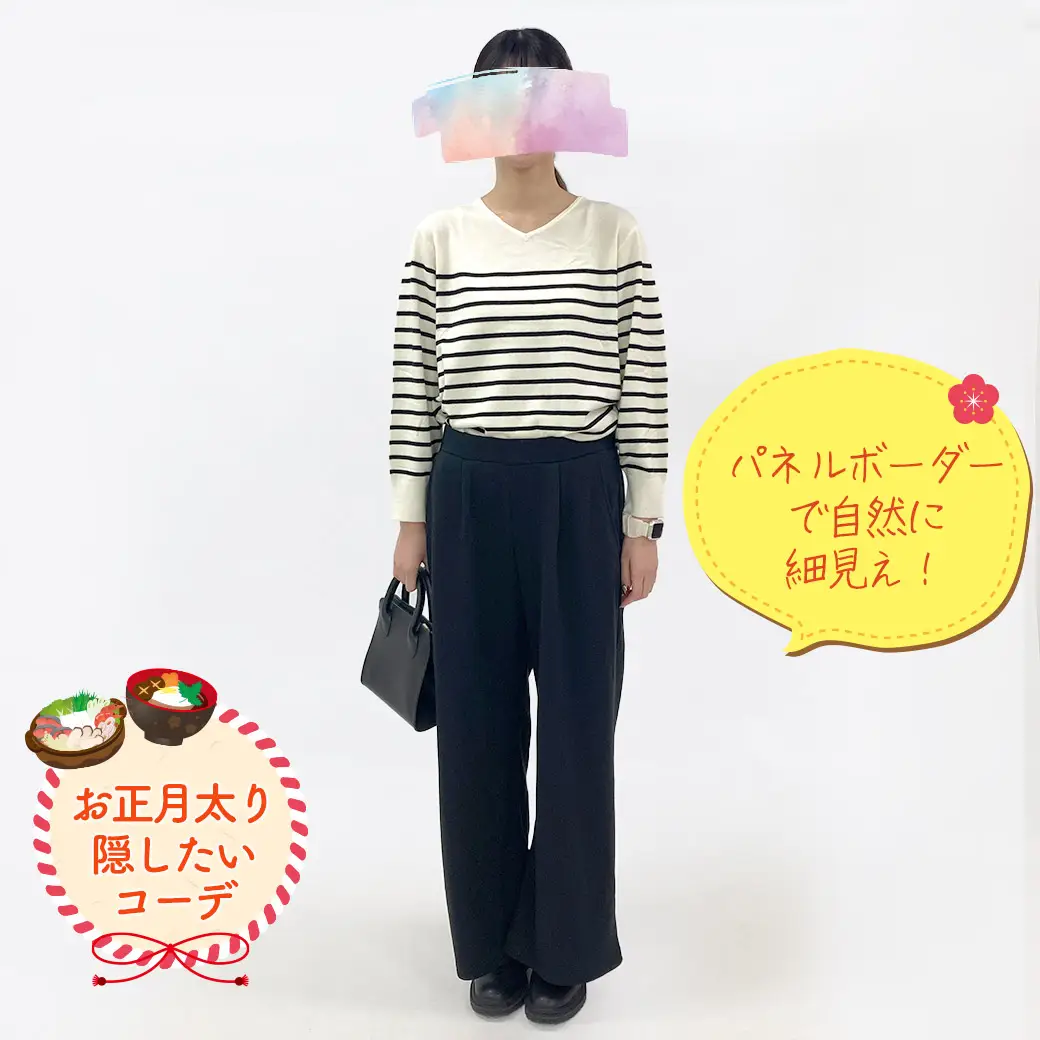 体型悩みを包み込むパネルボーダー×フレアシルエットで、自然に細見え。
