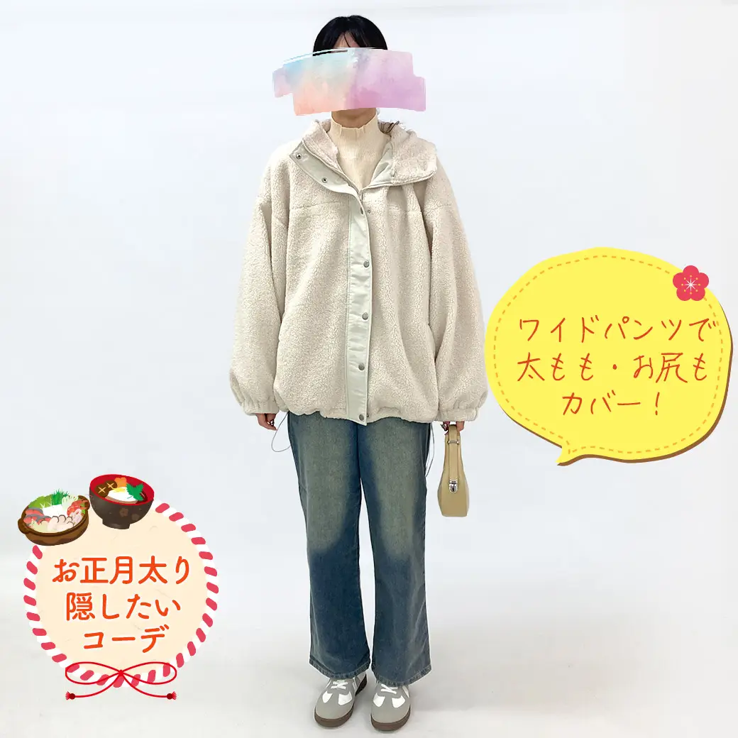 軽く羽織れるボアアウターであたたかさもキープできて、上下ゆるっとでもきれいにまとまる安心コーデです。