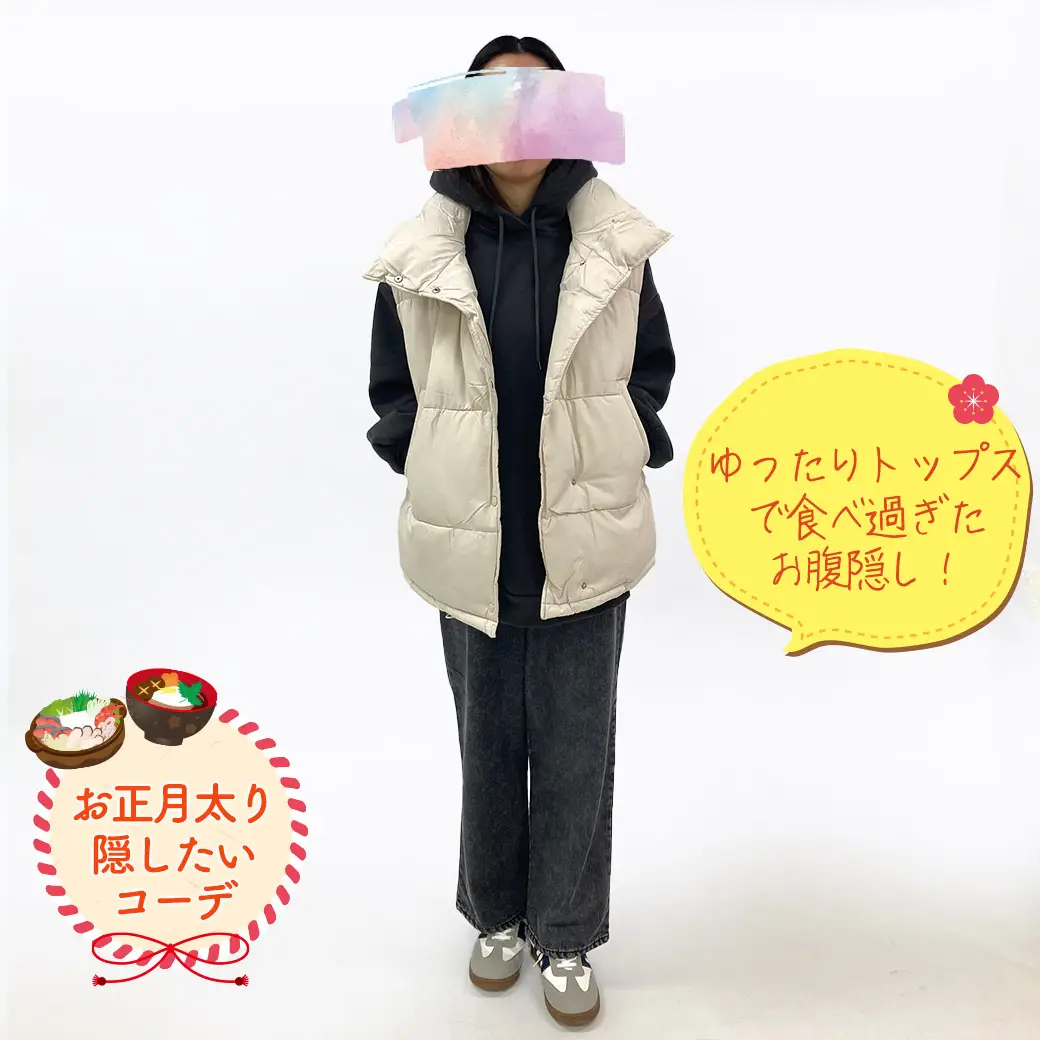 正月ゆったり休みのちょっと近所へのお出かけ♪トップスはゆったり暖かパーカーで食べ過ぎたお腹隠し。パンツも暖かくして冷え性の私にピッタリ!上下ポカポカなのでベストを合わせて。
