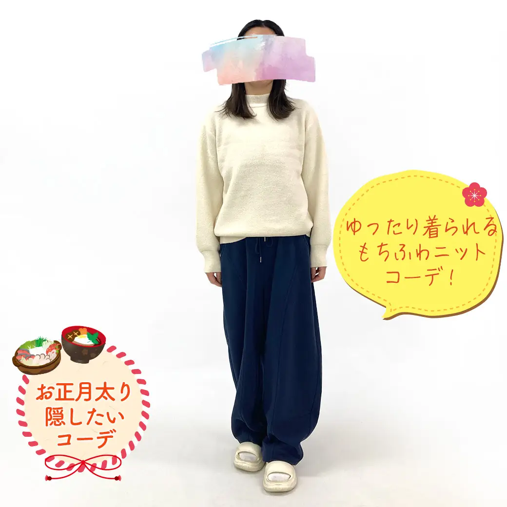 もちふわニットは肌触りも最高!ピッタリサイズでもゆったり着れるのが嬉しい♪トレンドのボトムを合わせラフな休日コーデの完成!