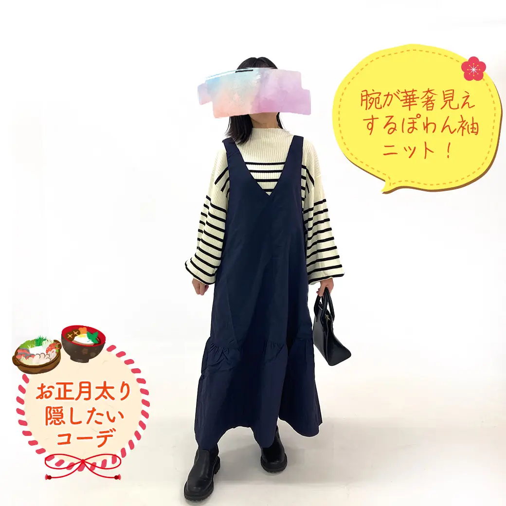 ぽわん袖と、高すぎないハイネックが着やすいポイント。小顔見えや腕が華奢に見える効果もあって、嬉しい♪ウエストマークできるジャンパースカートを合わせてお正月ぽっちゃりしてしまったボディーを包み隠す(笑)