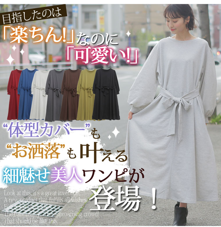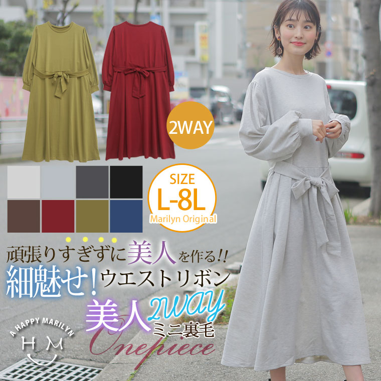 2WAY仕様が楽ちん可愛い♪ウエストリボン細魅せミニ裏毛フレアワンピース。 ★サイズ:L~8L ¥2,790(税込)