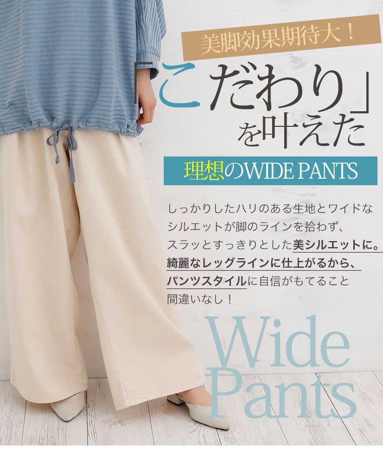 しっかりとしたハリのある生地とワイドなシルエットが脚のラインを拾わずスッキリとした美シルエットに。