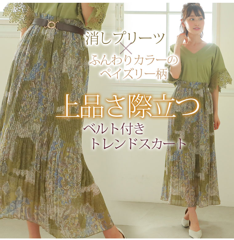 上品ペイズリー柄ベルト付き消しプリーツスカート