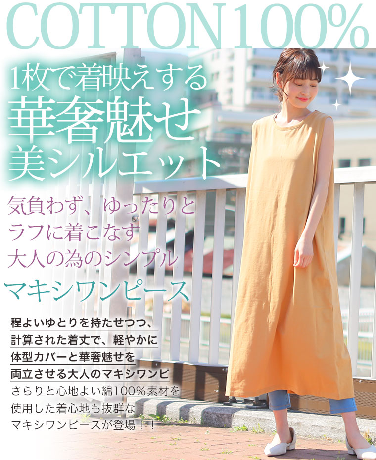 【綿100%/シリーズ】ノースリーブ マキシワンピース