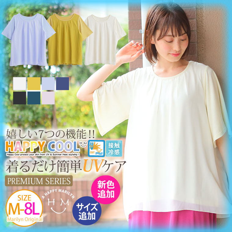 新色追加!! サイズ追加!! HAPPY COOL プレミアム お肌を守る嬉しい嬉しい7つの機能! UV・接触冷感 シフォン切替 Aライン 五分袖 トップス