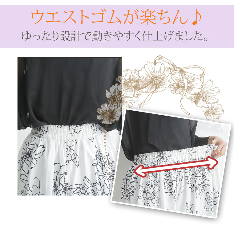 ワイドな裾とウエストゴムでゆったり楽ちん下半身カバー♪。 ★サイズ:LL~5L ¥ 3,690 (税込)
