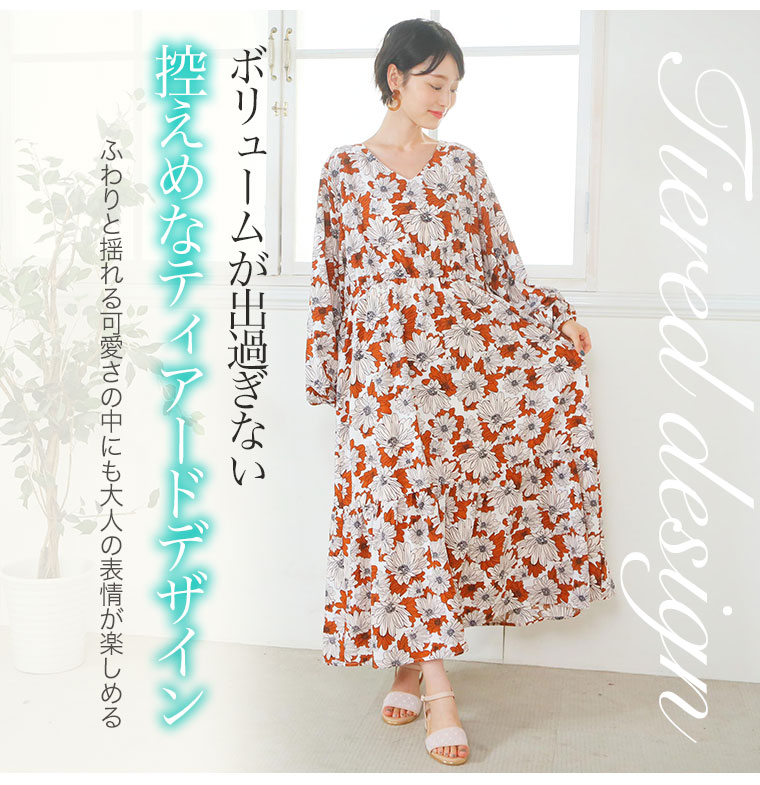 【新作◆8月12日販売】 大人レトロな デシン 花柄プリント ウエストゴム ティアード ロングワンピース