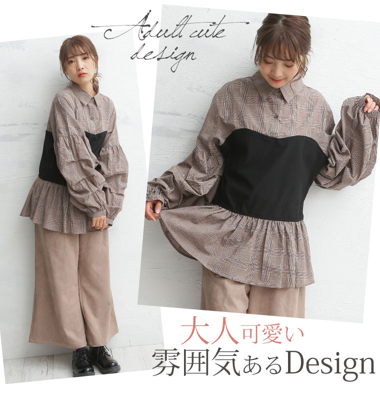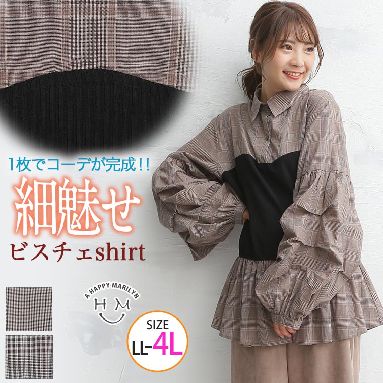 くびれ美人を作るこだわりの細魅せシルエット!フリルがかわいいチェックシャツ。 ★サイズ:LL~4L ¥2,490(税込)