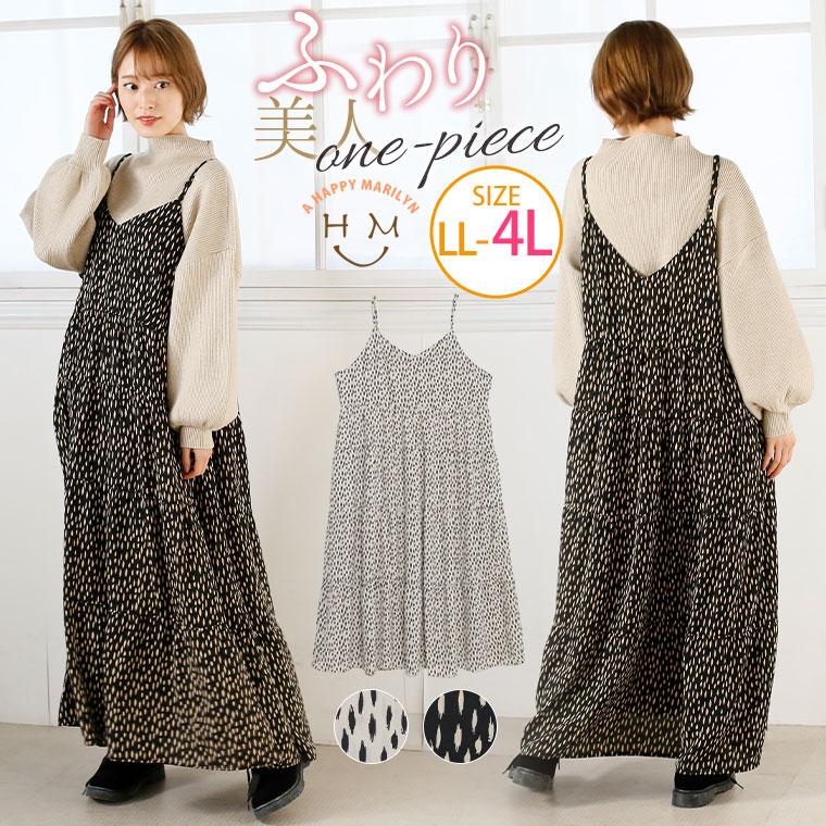 デシン変形ドット柄 ロングキャミワンピース。 ★サイズ:LL~4L ¥3,990(税込)