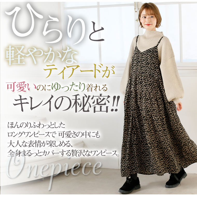 【新作◆11月30日販売】 デシン 変形ドット柄 プリント ティアード キャミ ロングワンピース OHS