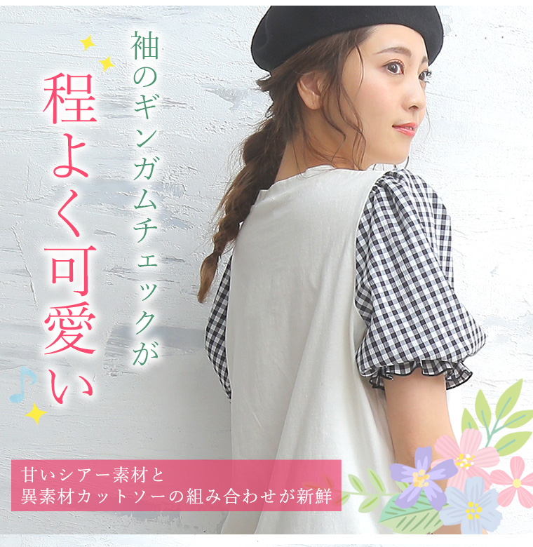 【新作◆5月31日販売】 袖 シアー ギンガム カットソー フロントタックデザインでゆったり着こなす。