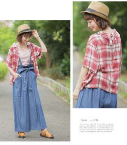 チェック柄 開襟 バックリボン 五分袖 シャツ